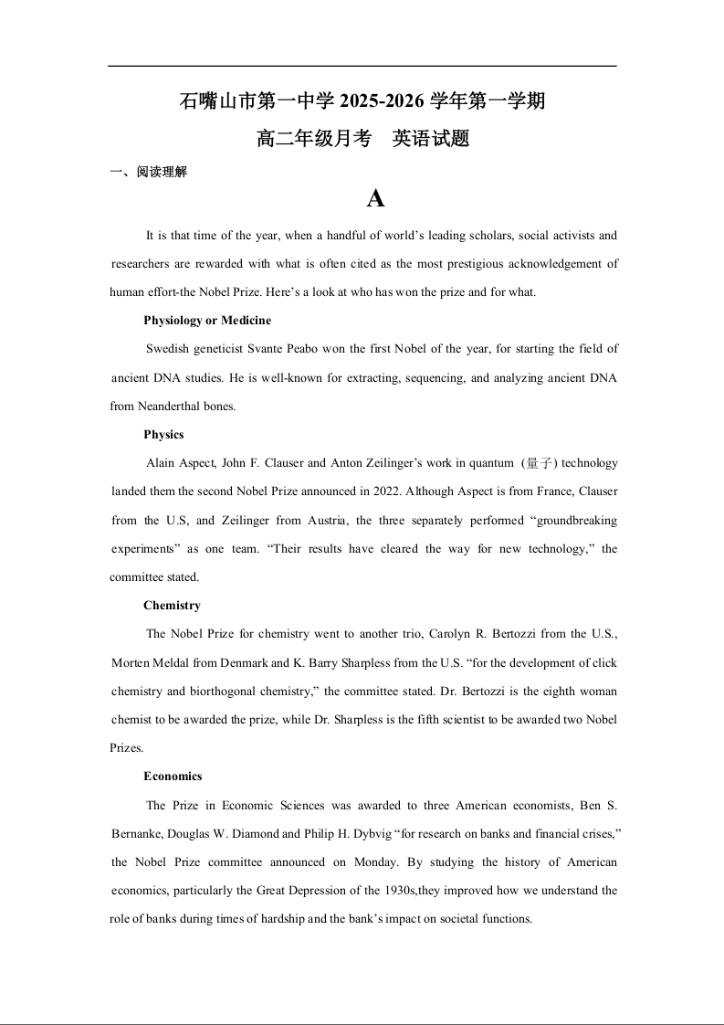 高二英语--宁夏回族自治区石嘴山市第一中学2025-2026学年高二上学期10月月考