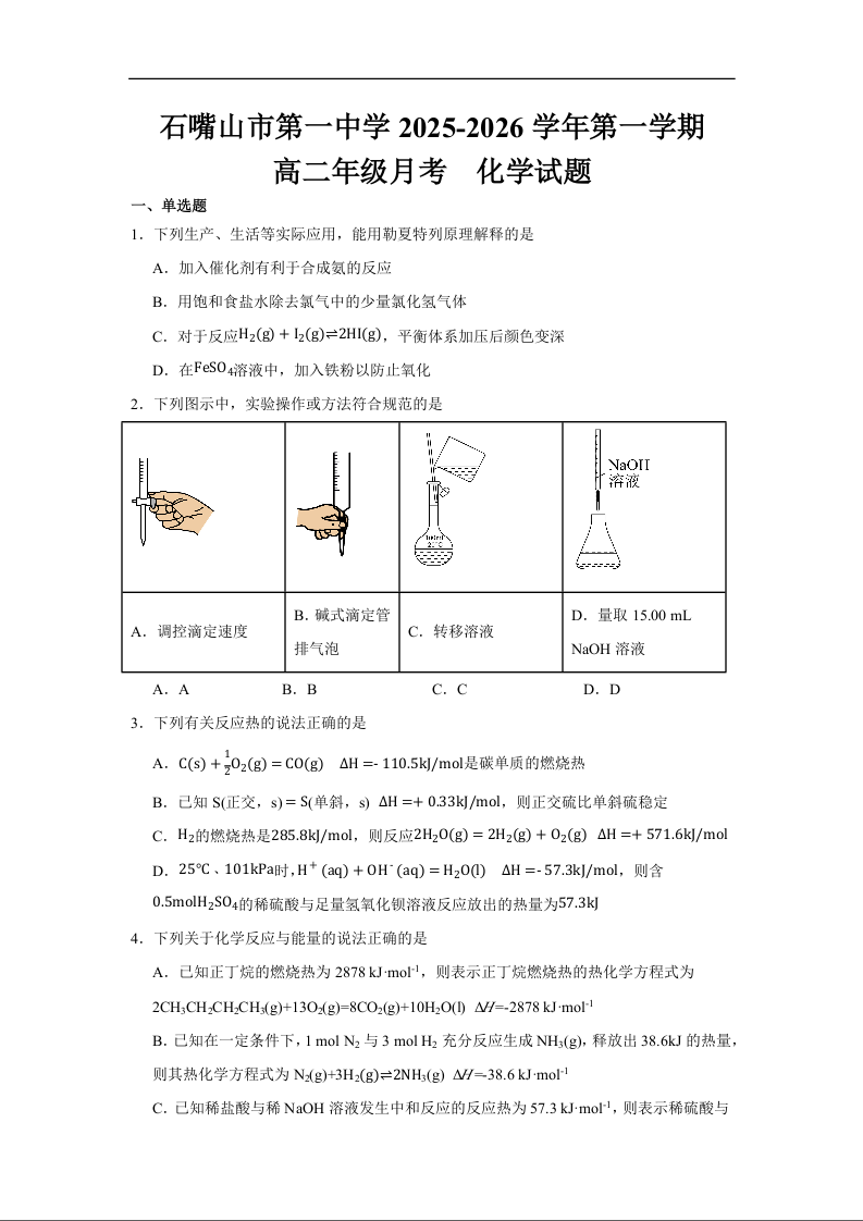 高二化学--宁夏回族自治区石嘴山市第一中学2025-2026学年高二上学期10月月考