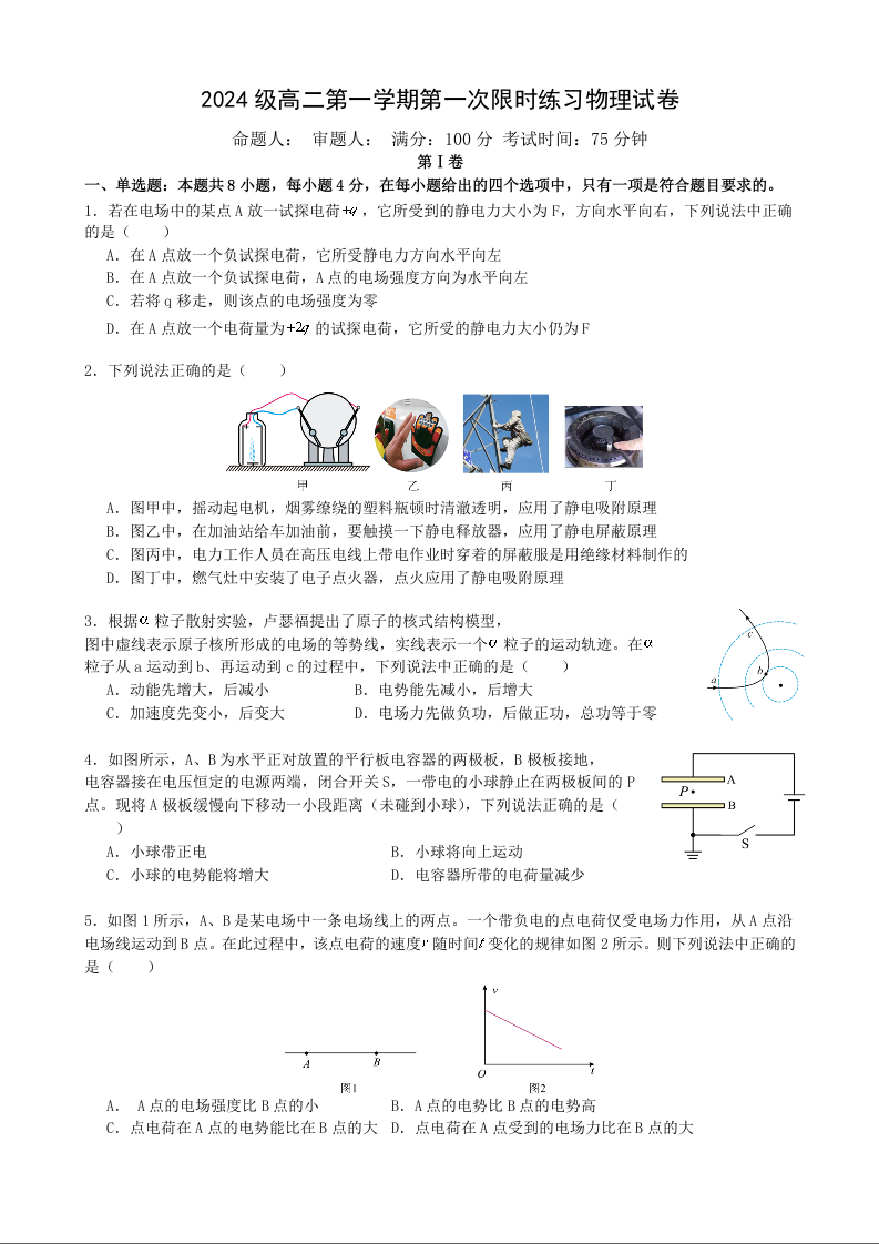 高二物理--安徽省合肥市第七中学2025-2026学年高二上学期第一次月考