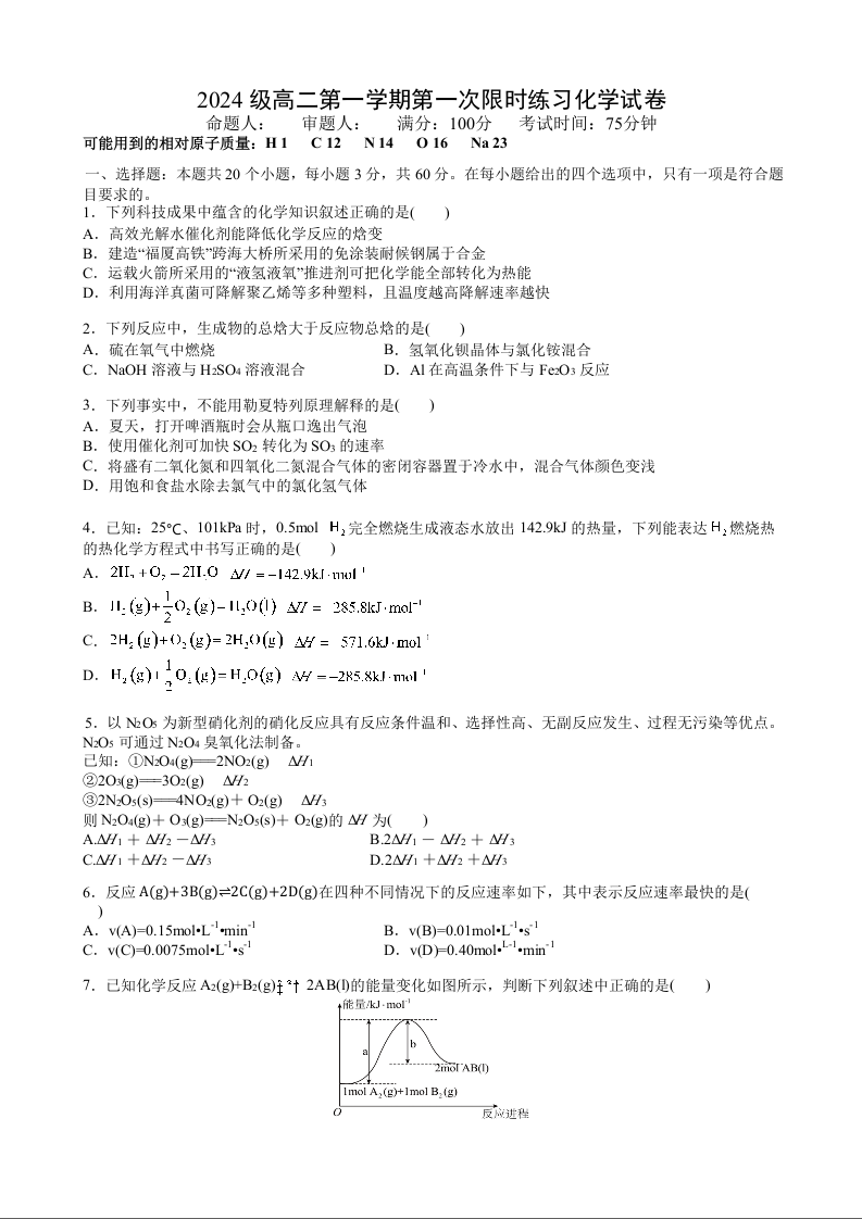 高二化学--安徽省合肥市第七中学2025-2026学年高二上学期第一次月考