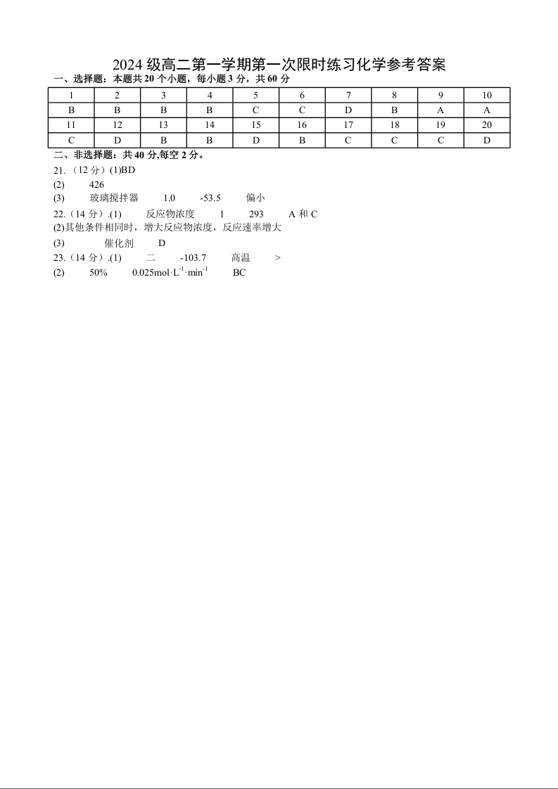 高二化学答案--安徽省合肥市第七中学2025-2026学年高二上学期第一次月考