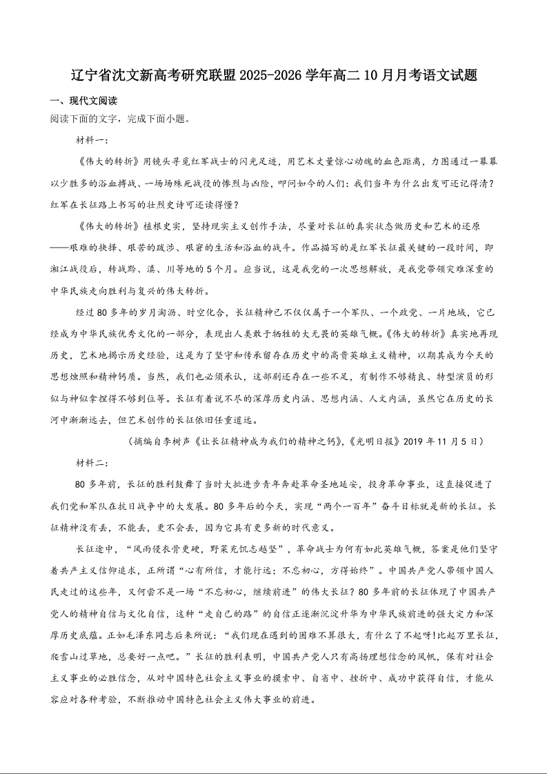高二语文+答案--辽宁省沈文新高考研究联盟2025-2026学年高二上学期10月质量监测