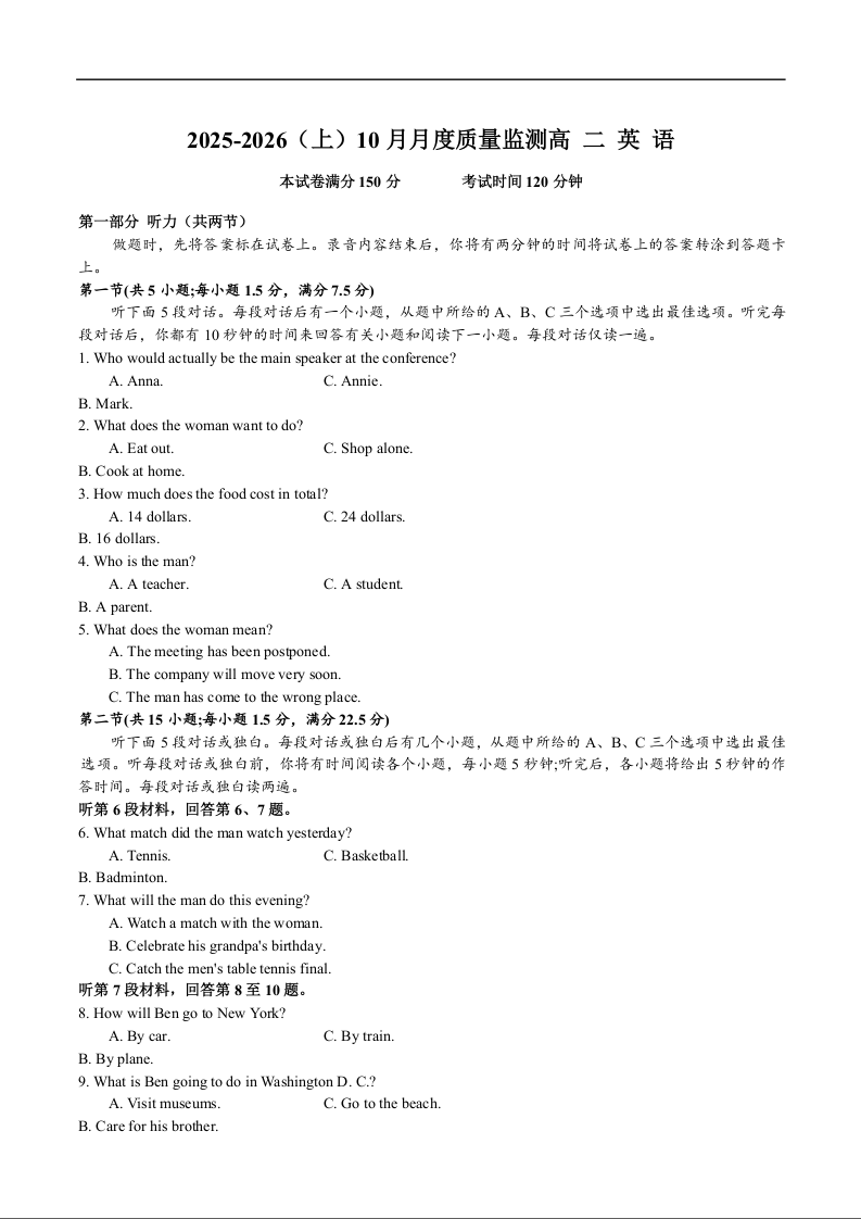 高二英语+答案--辽宁省沈文新高考研究联盟2025-2026学年高二上学期10月质量监测