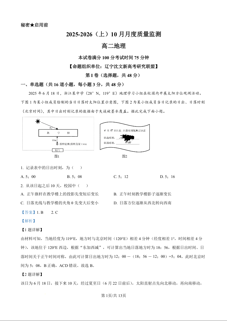 高二地理(解析版)--辽宁省沈文新高考研究联盟2025-2026学年高二上学期10月质量监测
