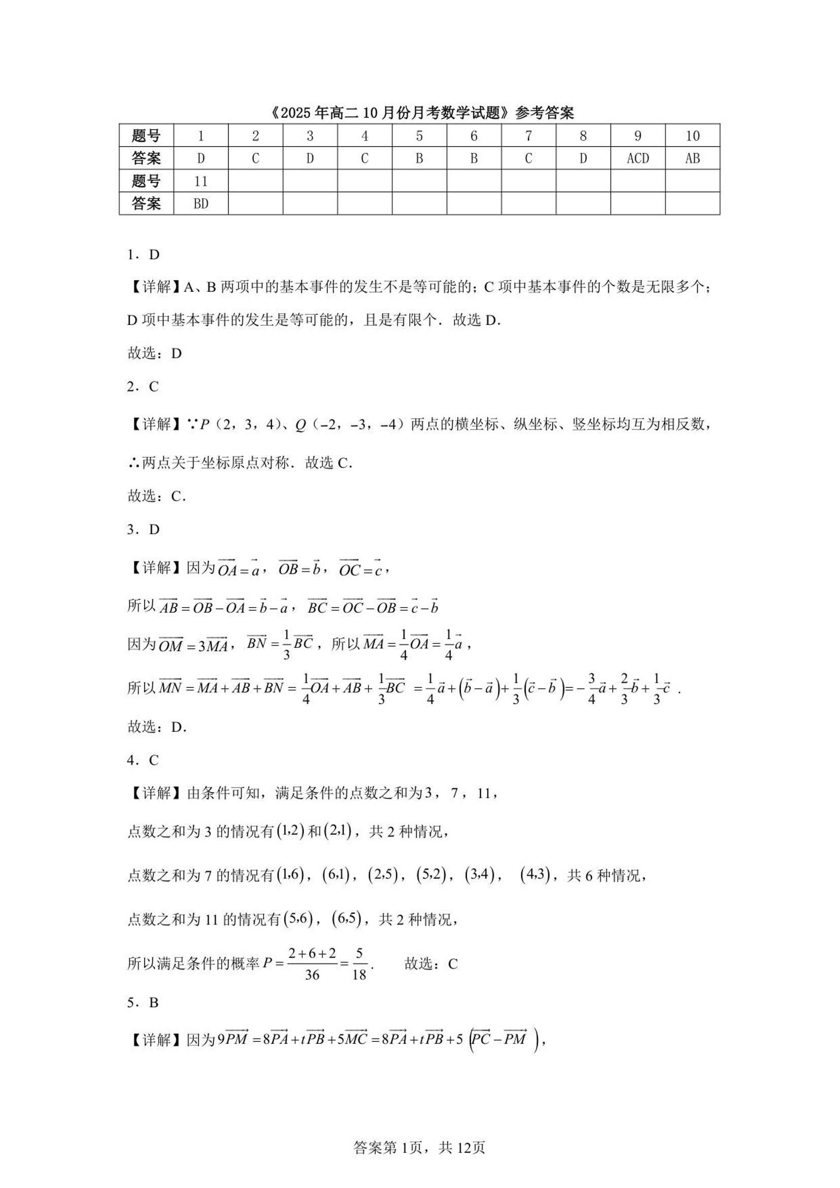 高二数学答案--山东省济宁市第一中学2025-2026学年高二上学期10月月考