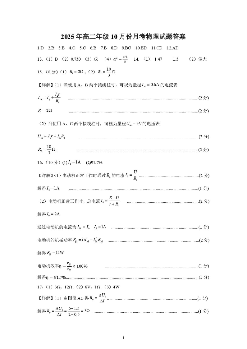 高二物理答案--山东省济宁市第一中学2025-2026学年高二上学期10月月考