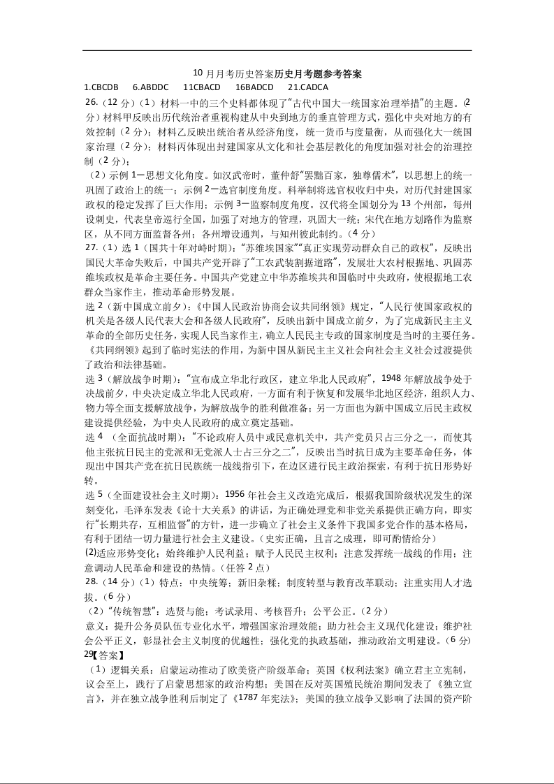 高二历史答案--山东省济宁市第一中学2025-2026学年高二上学期10月月考