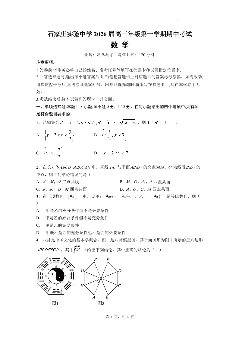 高三数学--河北省石家庄实验中学2026届高三年级第一学期期中考试