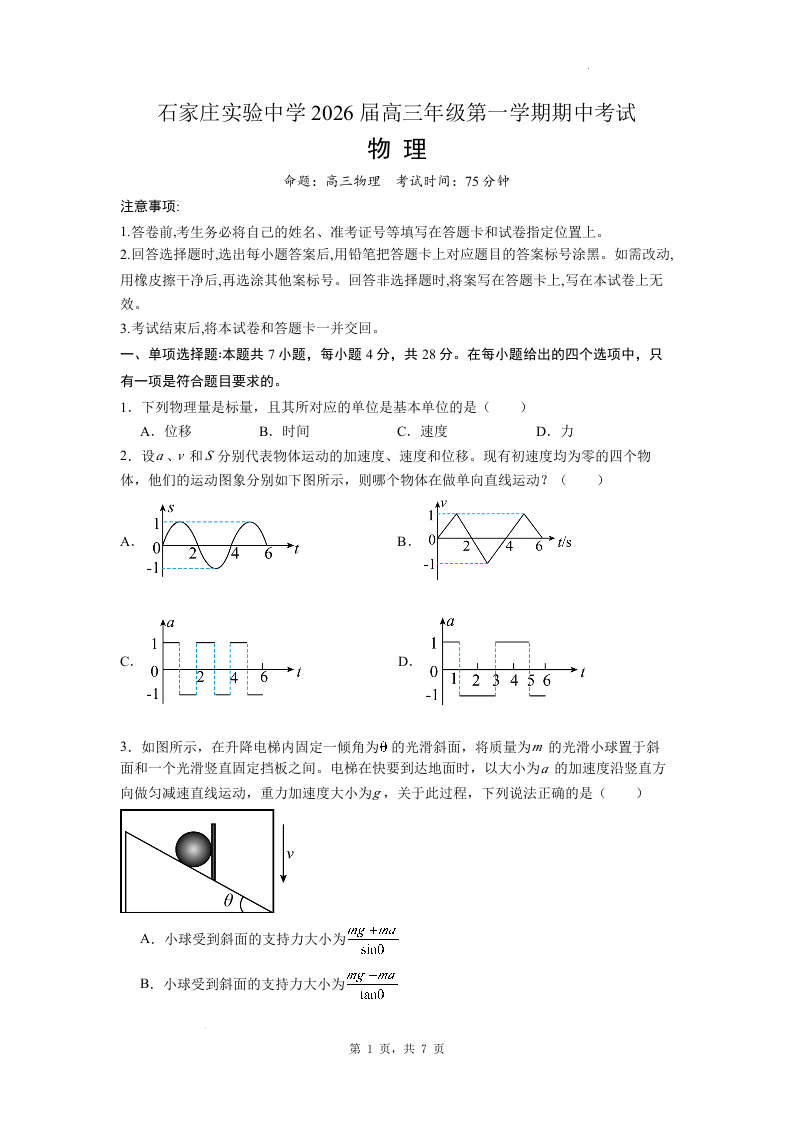 高三物理--河北省石家庄实验中学2026届高三年级第一学期期中考试