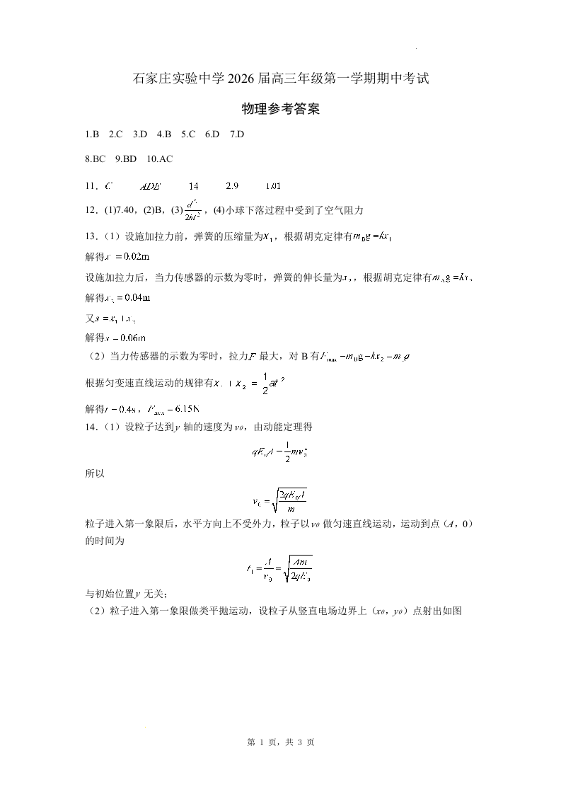 高三物理答案--河北省石家庄实验中学2026届高三年级第一学期期中考试