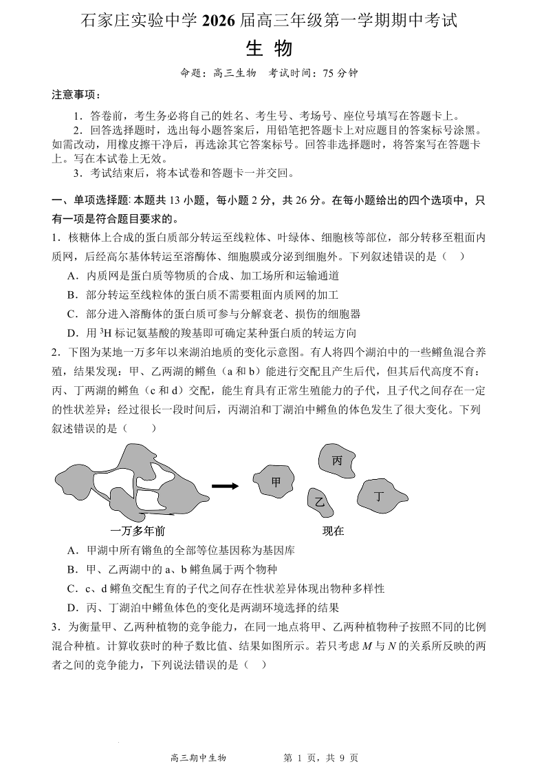 高三生物--河北省石家庄实验中学2026届高三年级第一学期期中考试