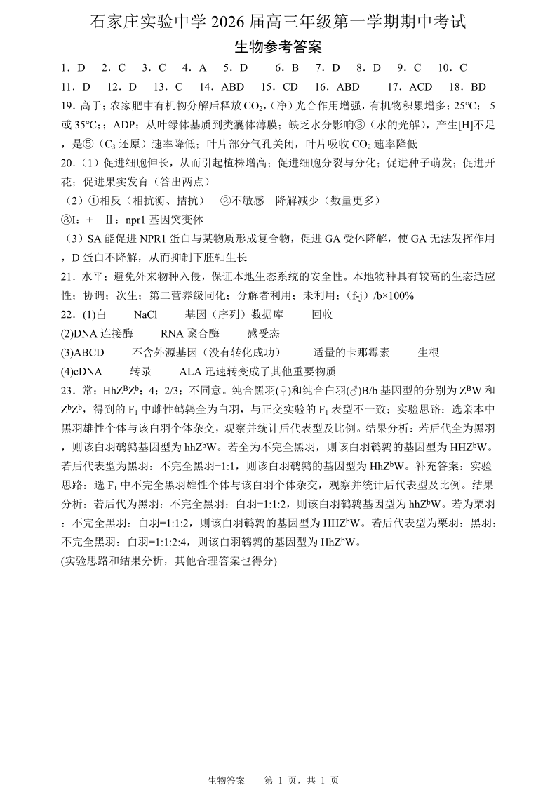 高三生物答案--河北省石家庄实验中学2026届高三年级第一学期期中考试
