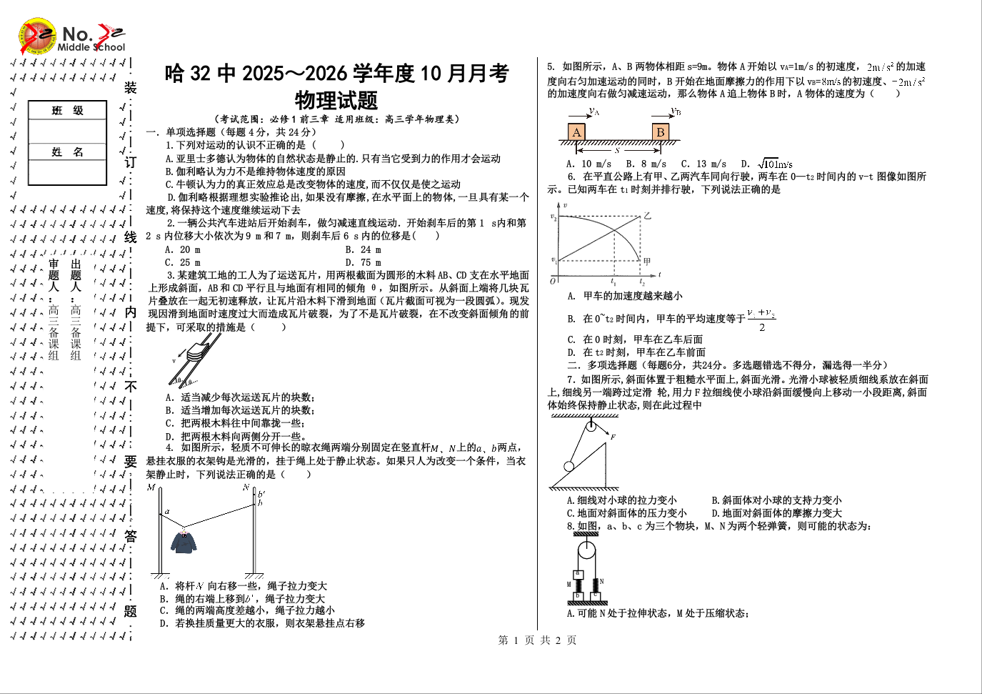 高三物理+答案--黑龙江省哈尔滨市第三十二中学校2026届高三上学期10月月考