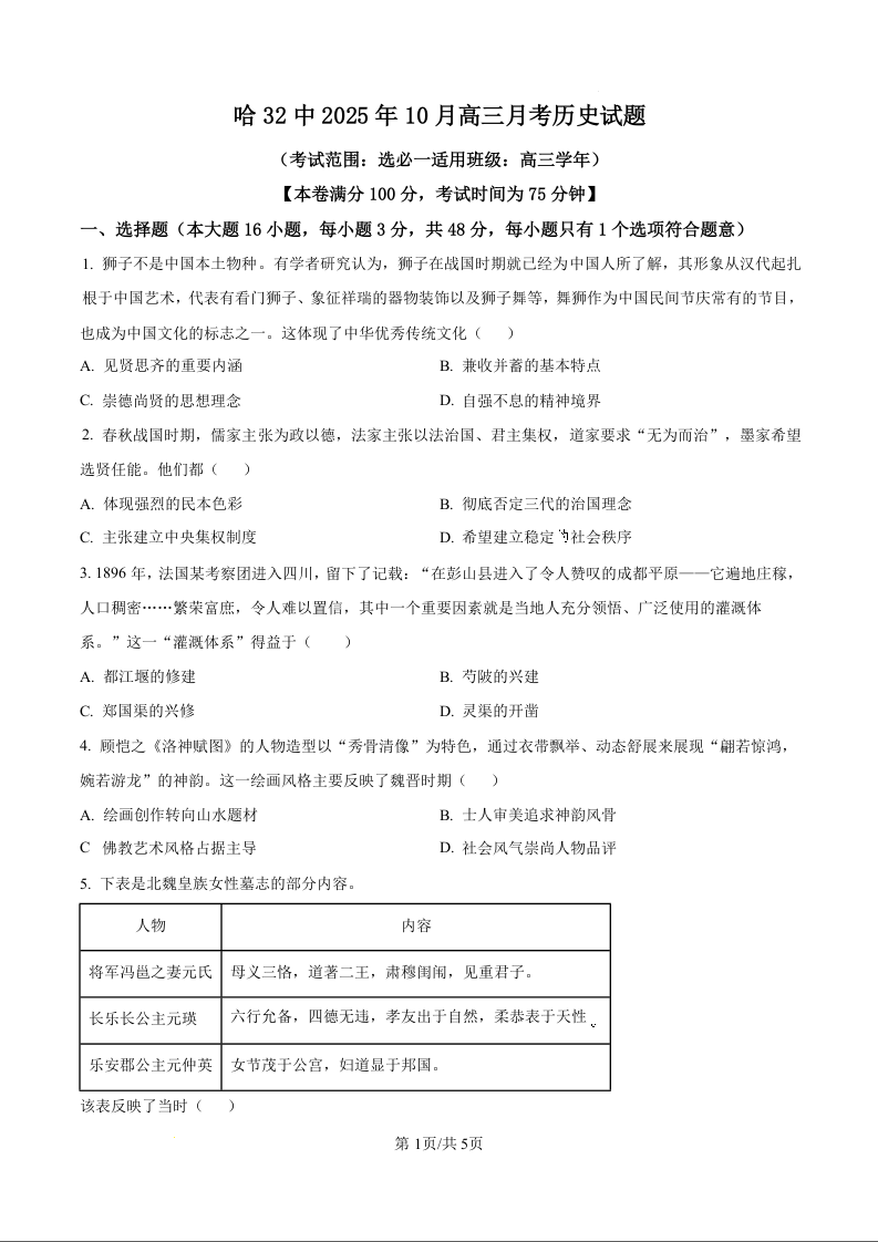 高三历史(原卷版)--黑龙江省哈尔滨市第三十二中学校2026届高三上学期10月月考