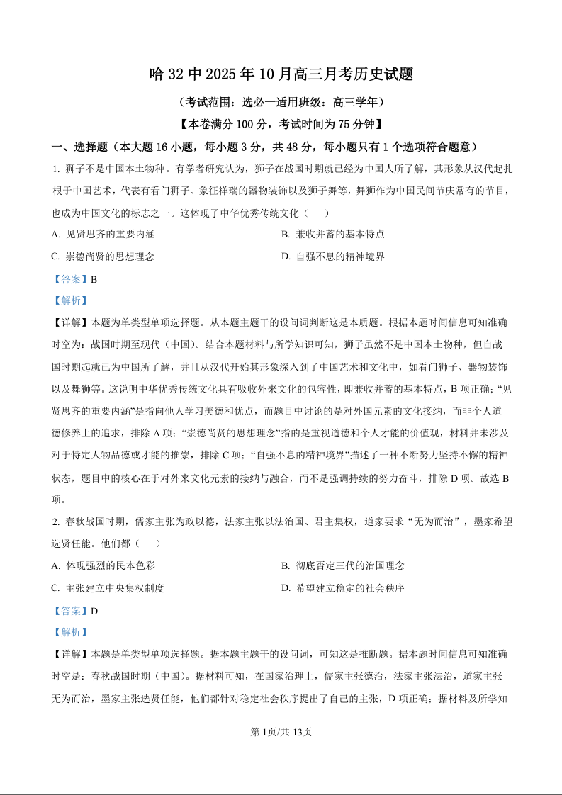高三历史(精品解析版)--黑龙江省哈尔滨市第三十二中学校2026届高三上学期10月月考