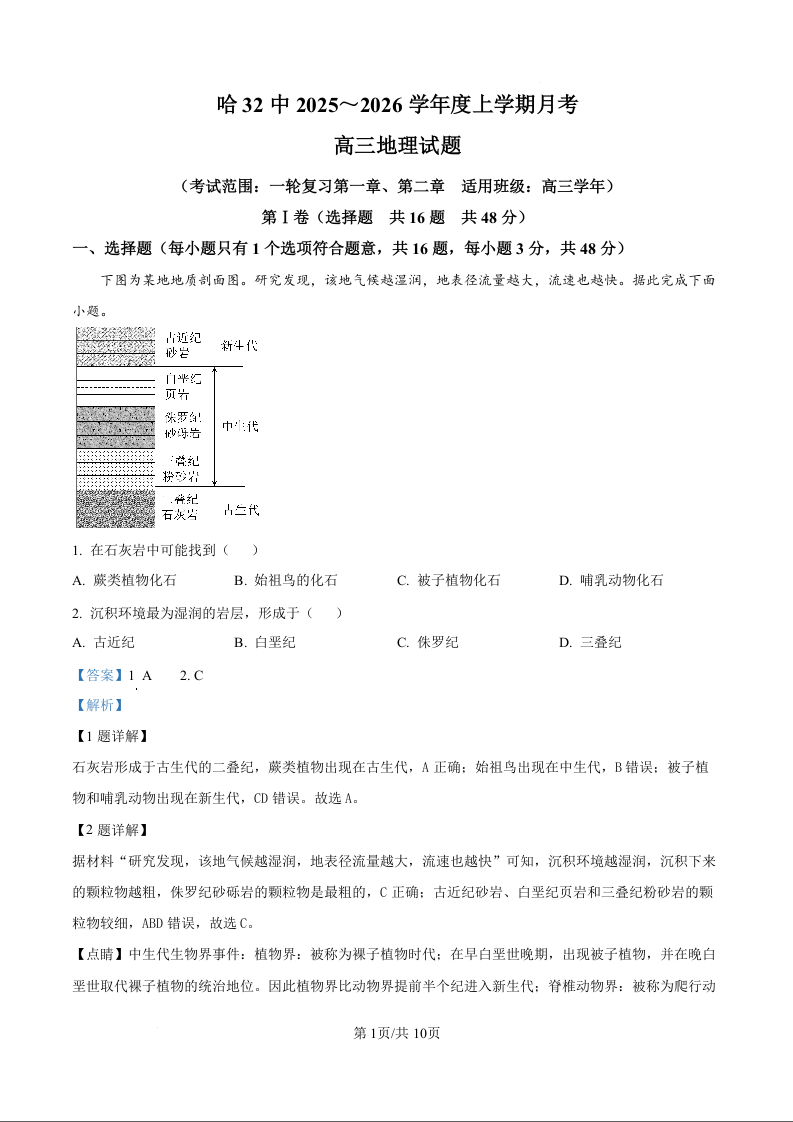 高三地理(精品解析版)--黑龙江省哈尔滨市第三十二中学校2026届高三上学期10月月考