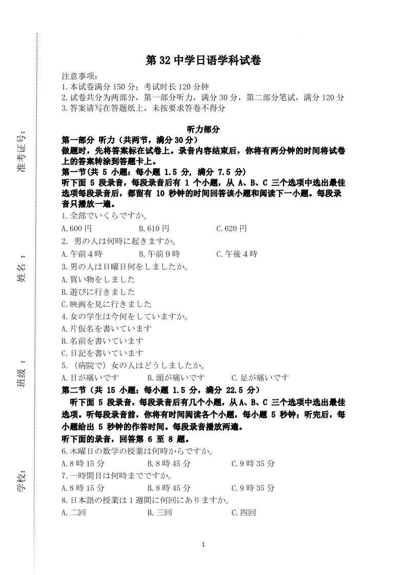 高三日语+答案--黑龙江省哈尔滨市第三十二中学校2026届高三上学期10月月考