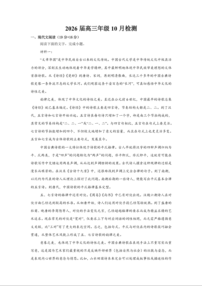 高三语文+答案--江苏省南京市第二十九中学2026届高三上学期10月月考