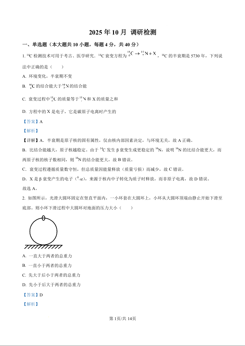 高三物理(精品解析版)--江苏省南京市第二十九中学2026届高三上学期10月月考