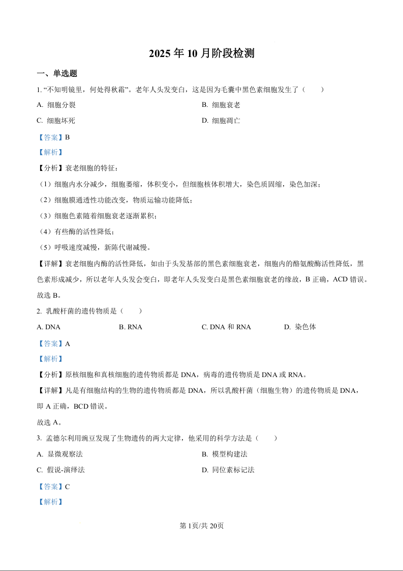 高三生物(精品解析版)--江苏省南京市第二十九中学2026届高三上学期10月月考