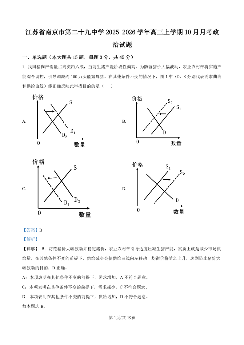 高三政治(精品解析版)--江苏省南京市第二十九中学2026届高三上学期10月月考