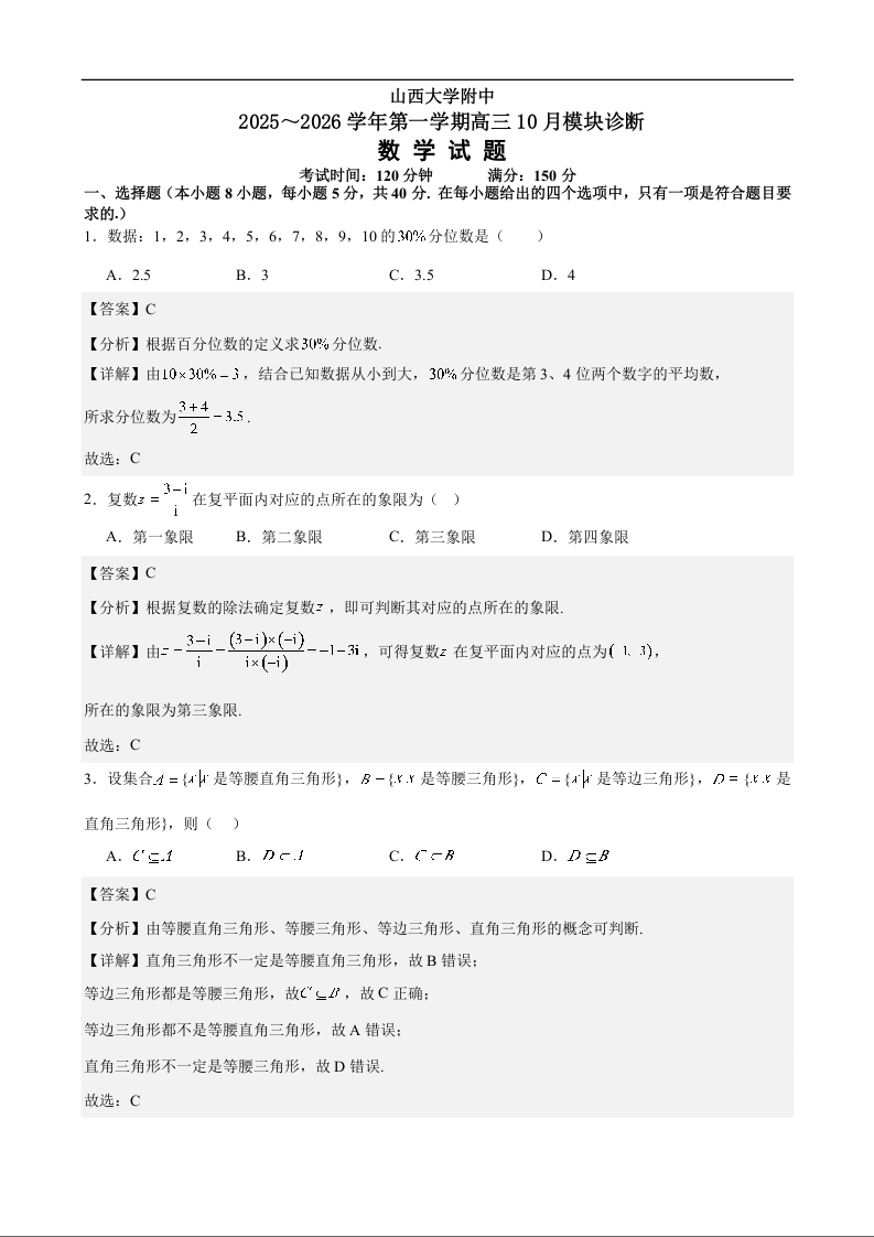 高三数学答案--山西大学附属中学校2026届高三上学期10月模块诊断