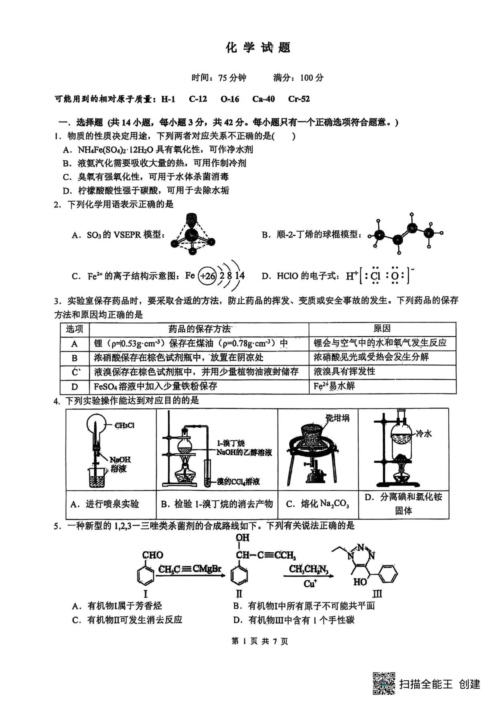 高三化学--山西大学附属中学校2026届高三上学期10月模块诊断