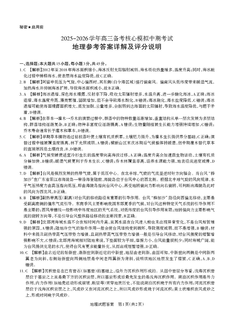 高三地理答案--山西省思而行2026届高三上学期备考核心模拟中期考试