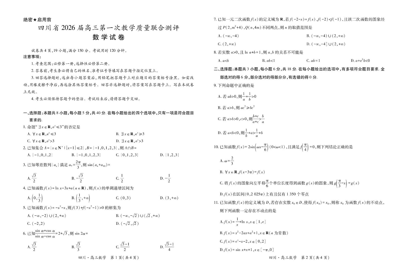 高三数学+答案--四川省大数据智学领航联盟2026届高三第一次教学质量联合测评