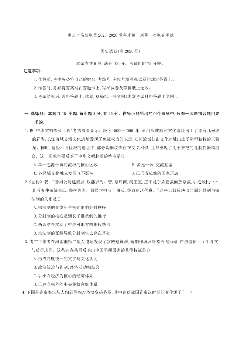 高三历史--重庆市名校联盟2026届高三上学期第一次联合考试