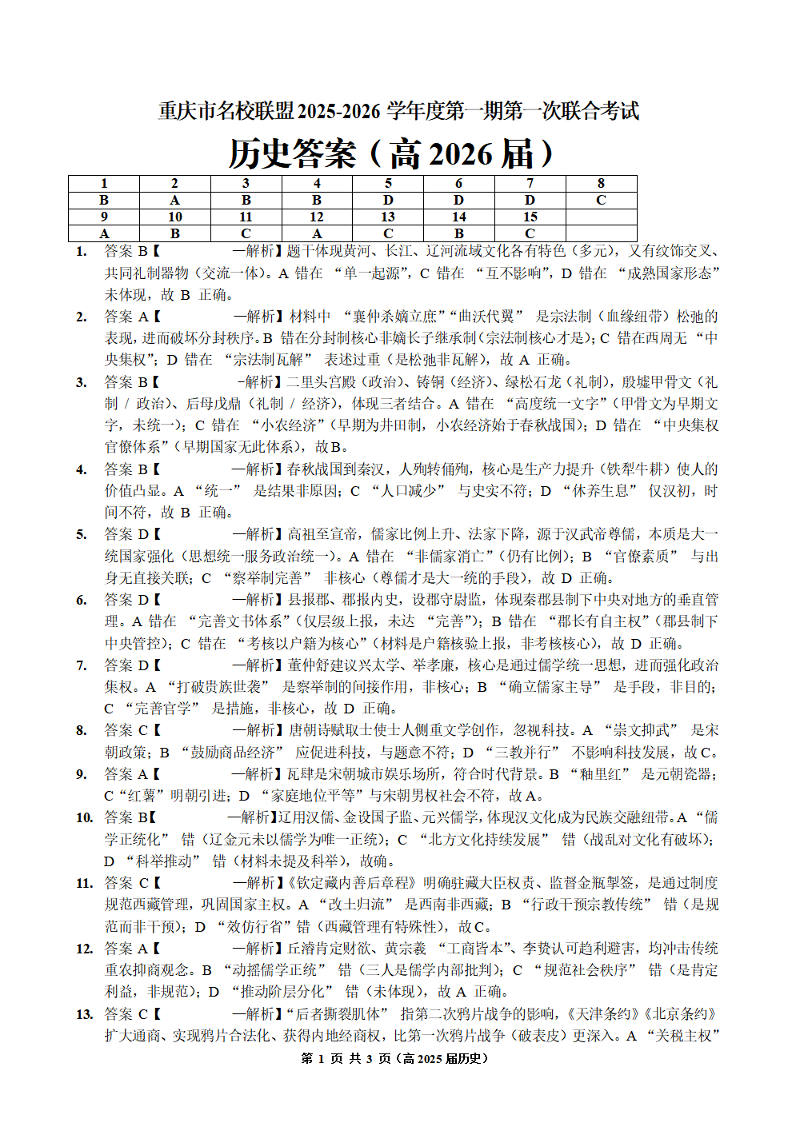 高三历史答案--重庆市名校联盟2026届高三上学期第一次联合考试