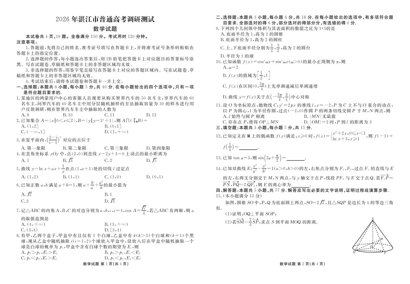 高三数学--广东省湛江市2026届高三普通高考10月调研测试