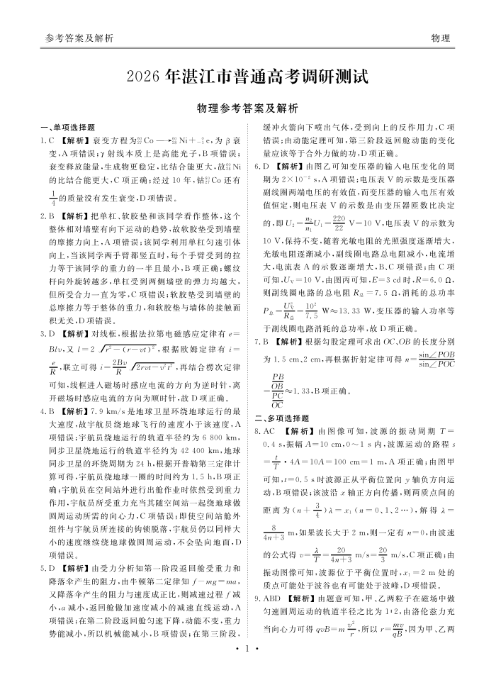 高三物理答案--广东省湛江市2026届高三普通高考10月调研测试