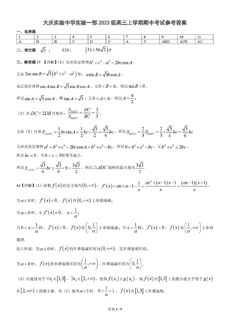 高三数学答案--黑龙江省大庆市实验中学2026届高三上学期10月期中考试