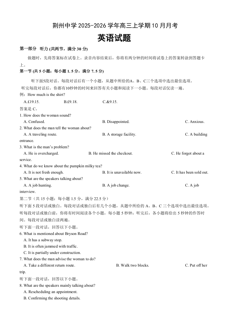高三英语--湖北省荆州中学2026届高三上学期10月月考