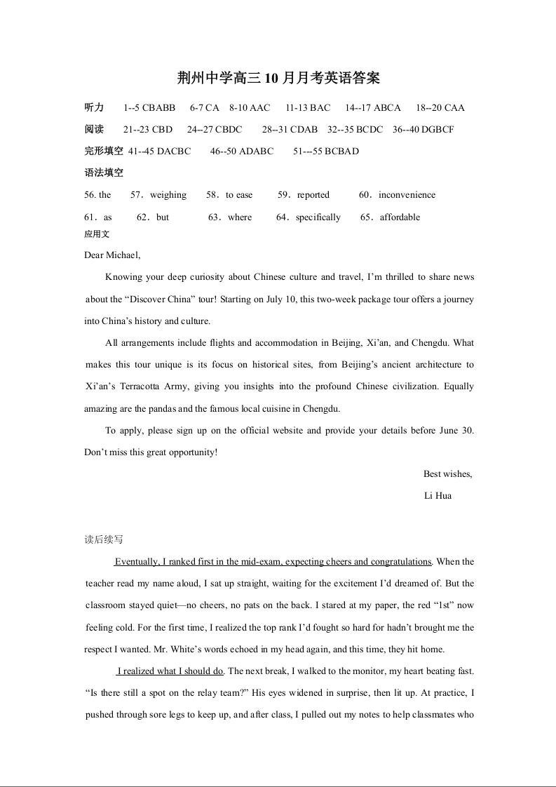 高三英语答案--湖北省荆州中学2026届高三上学期10月月考