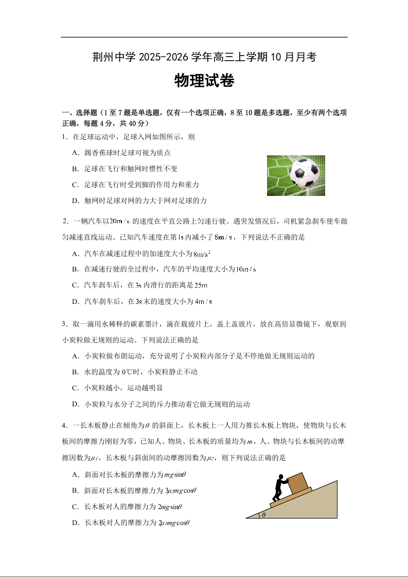 高三物理+答案--湖北省荆州中学2026届高三上学期10月月考