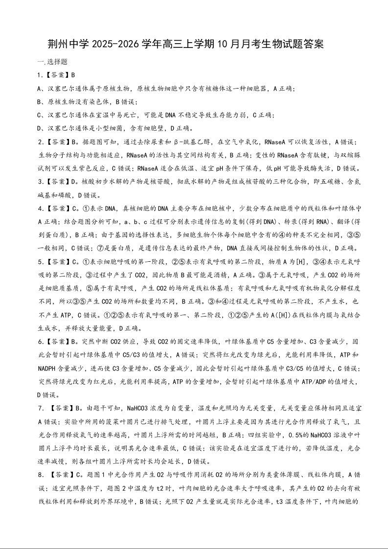 高三生物答案--湖北省荆州中学2026届高三上学期10月月考
