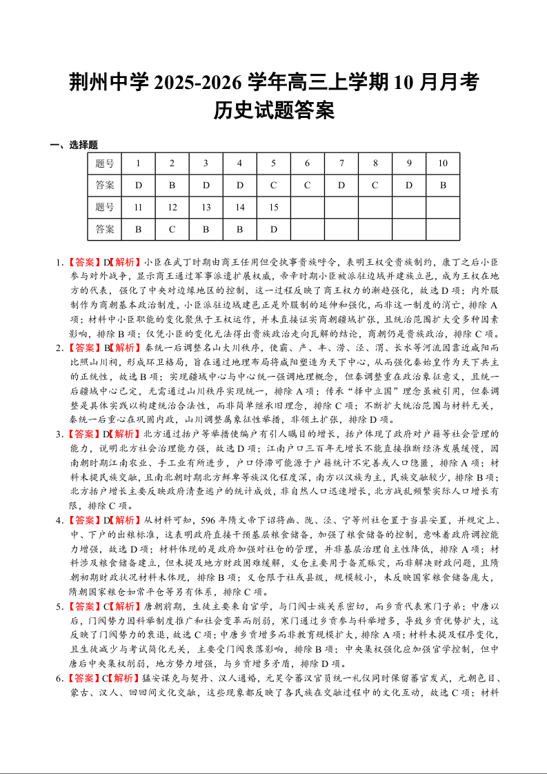 高三历史答案--湖北省荆州中学2026届高三上学期10月月考