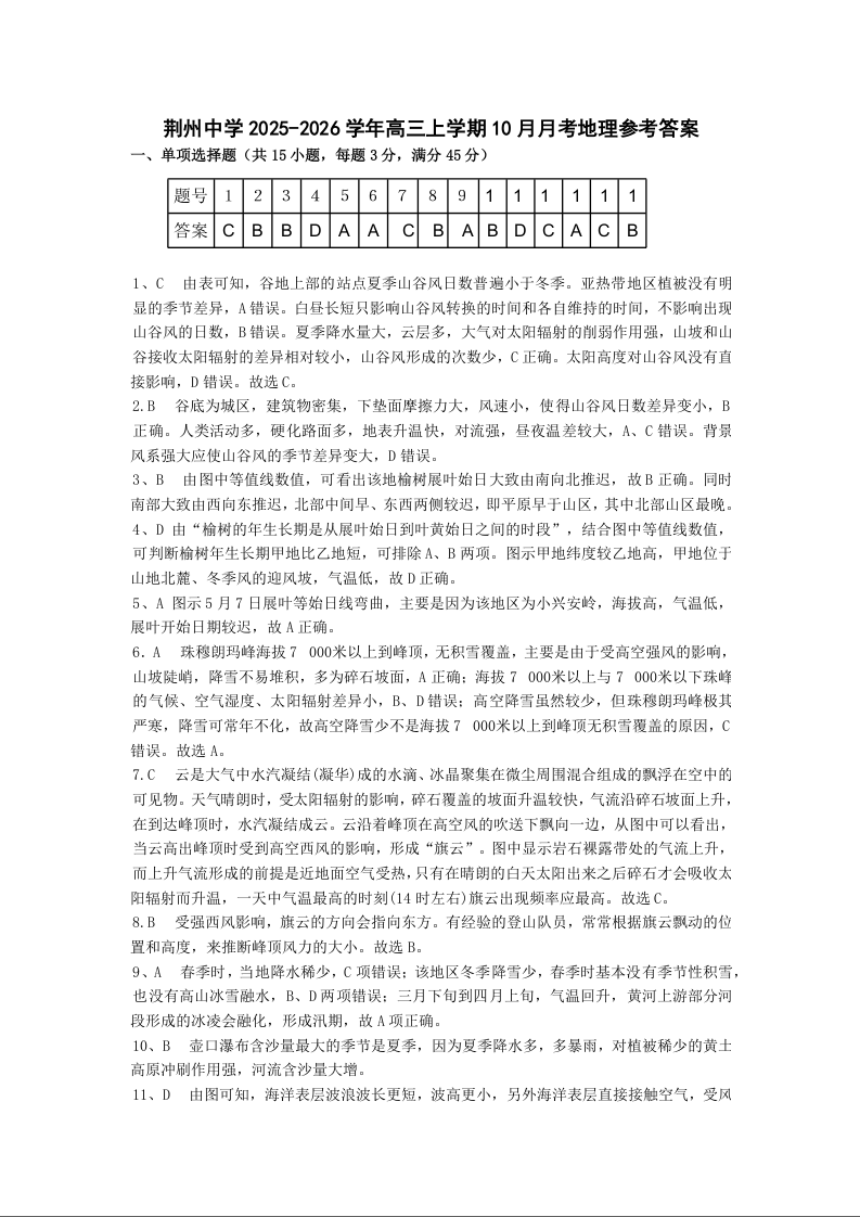 高三地理答案--湖北省荆州中学2026届高三上学期10月月考