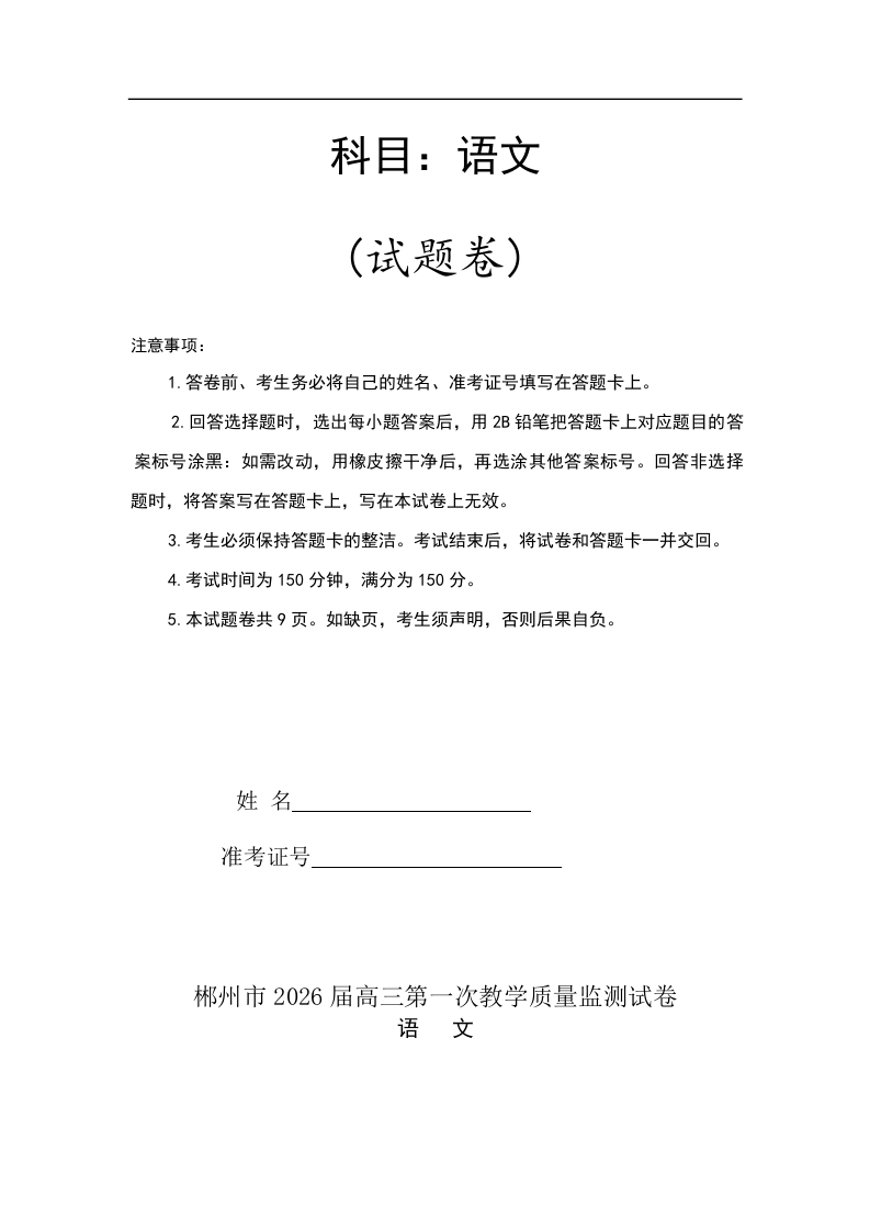 高三语文--湖南省郴州市2026届高三上学期第一次教学质量监测