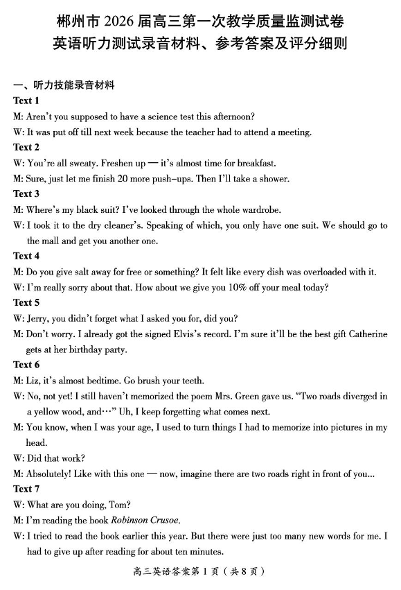 高三英语答案--湖南省郴州市2026届高三上学期第一次教学质量监测