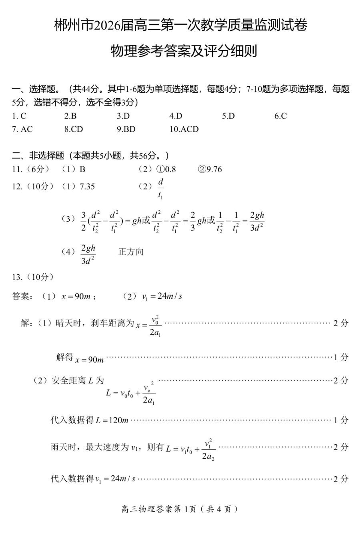 高三物理答案--湖南省郴州市2026届高三上学期第一次教学质量监测
