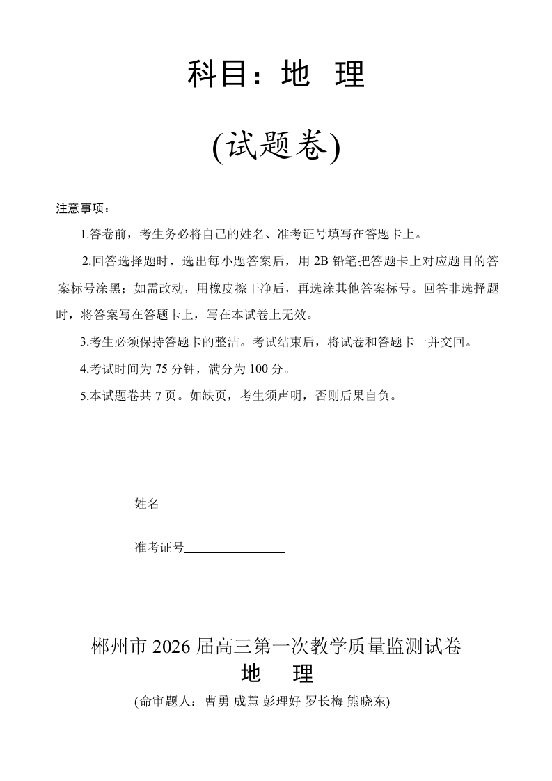 高三地理+答案--湖南省郴州市2026届高三上学期第一次教学质量监测