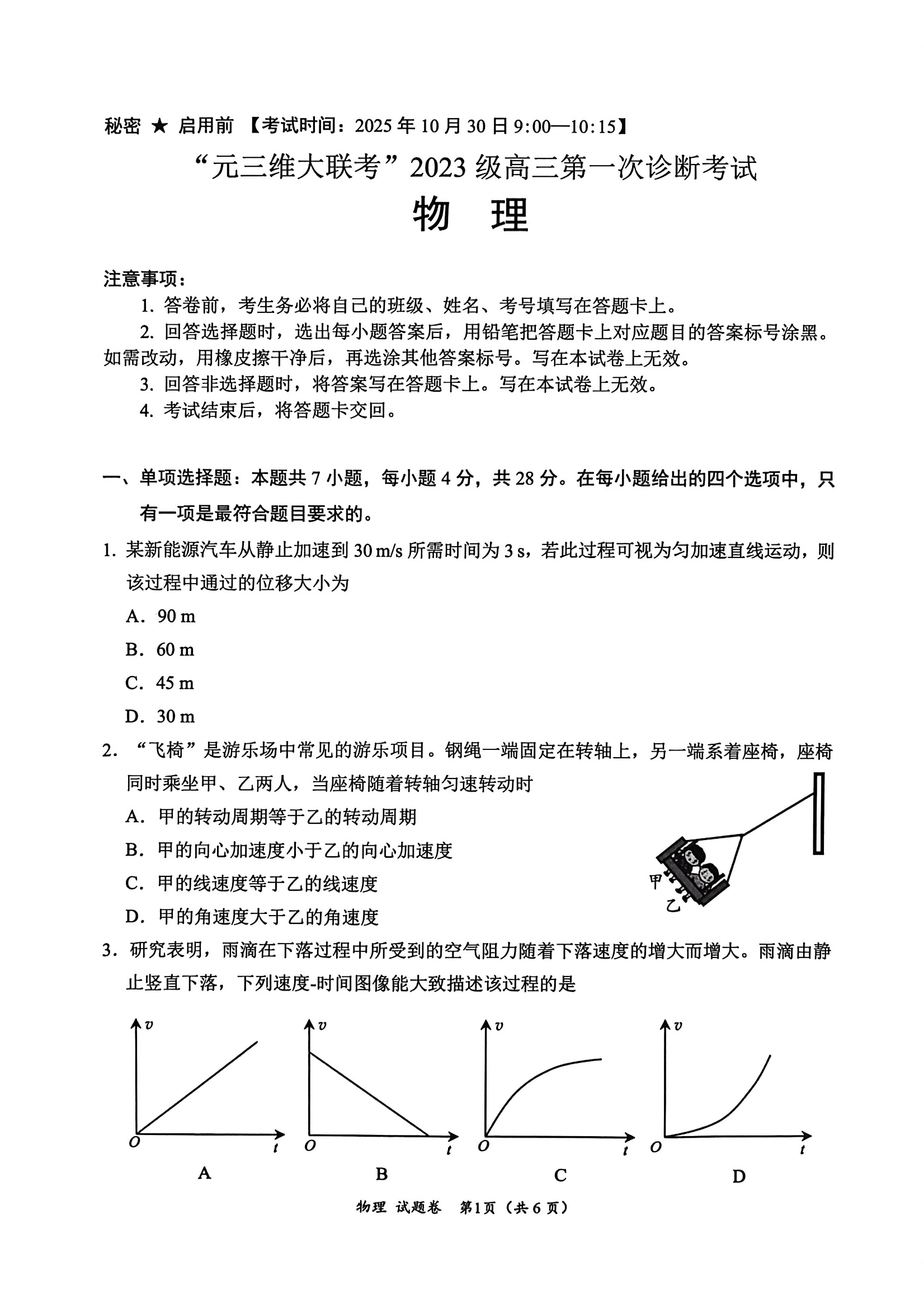 高三物理--四川省元三维大联考2023级高三第一次诊断考试