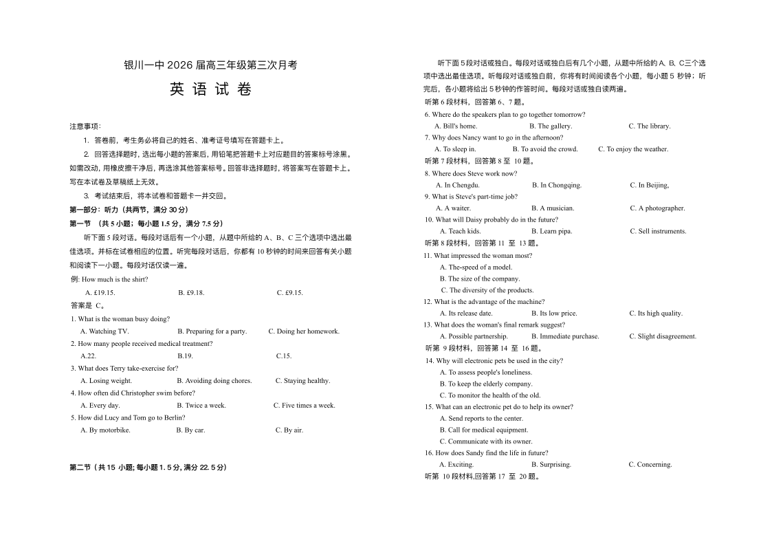 高三英语+答案--宁夏回族自治区银川一中2026届高三年级第三次月考