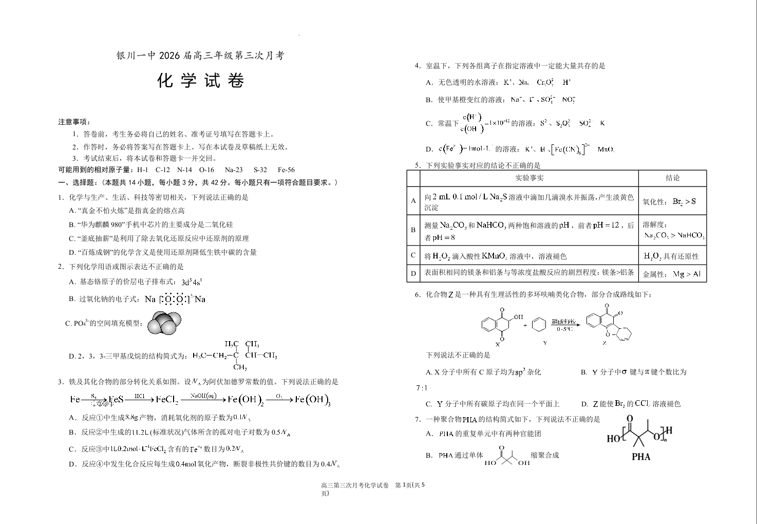 高三化学--宁夏回族自治区银川一中2026届高三年级第三次月考