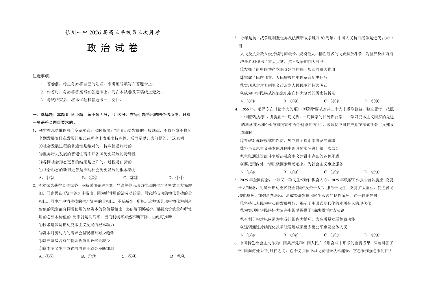 高三政治--宁夏回族自治区银川一中2026届高三年级第三次月考