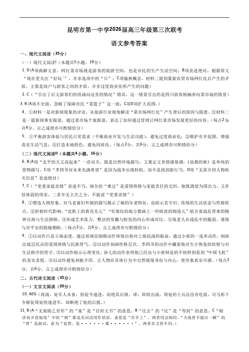 高三语文答案--云南省昆明市第一中学2026届高三上学期第三次联考