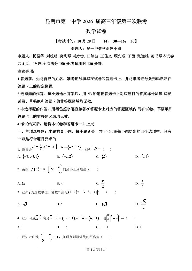 高三数学(原卷版)--云南省昆明市第一中学2026届高三上学期第三次联考
